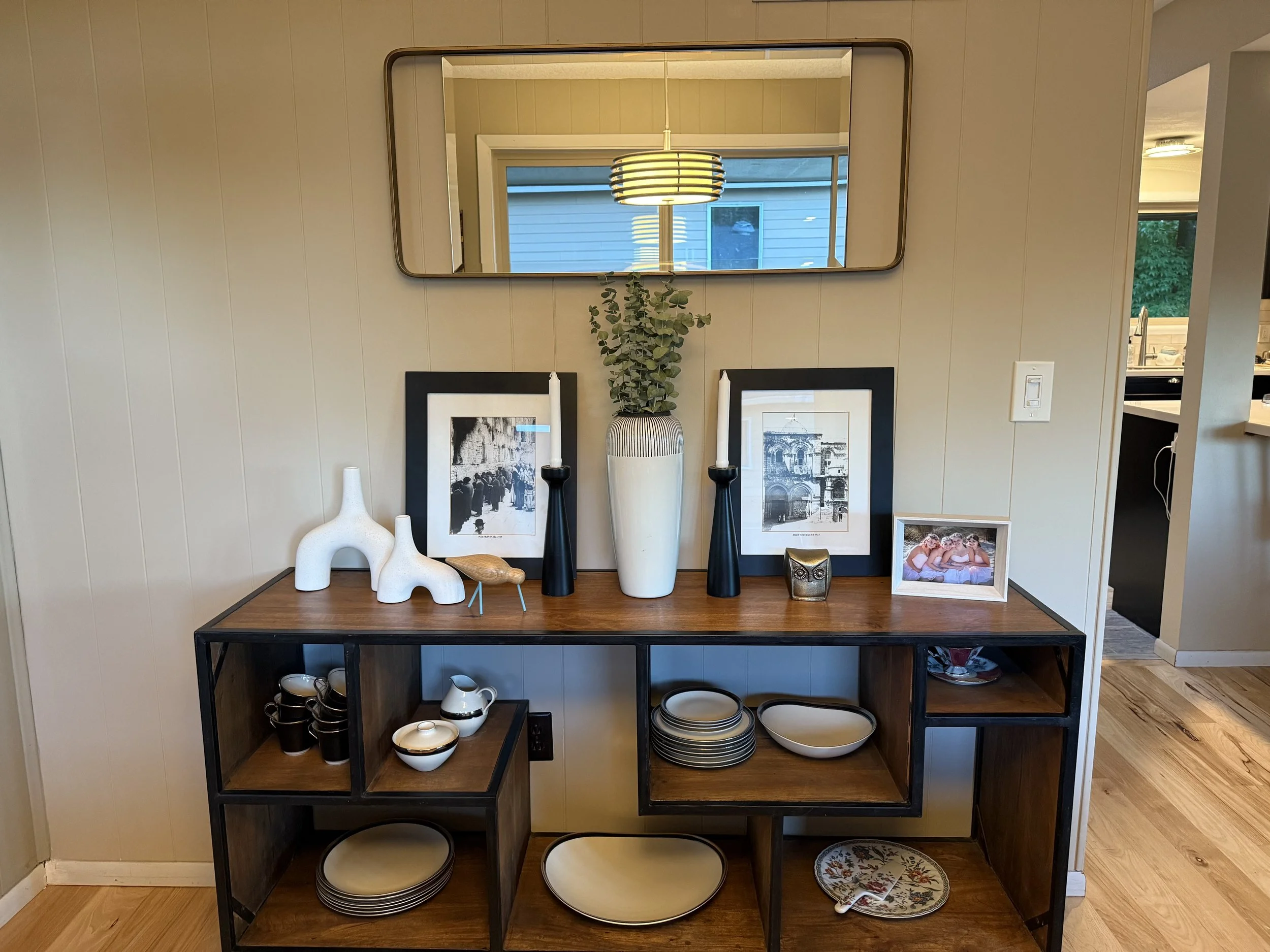 A wooden sideboard displaying black and white framed photos, vases, black candle holders with white candles, and a small silver owl figurine. The sideboard has open shelves with dishes and bowls. A large mirror hangs above the sideboard, and a gray wall with vertical paneling is behind it. Part of a kitchen is visible on the right.