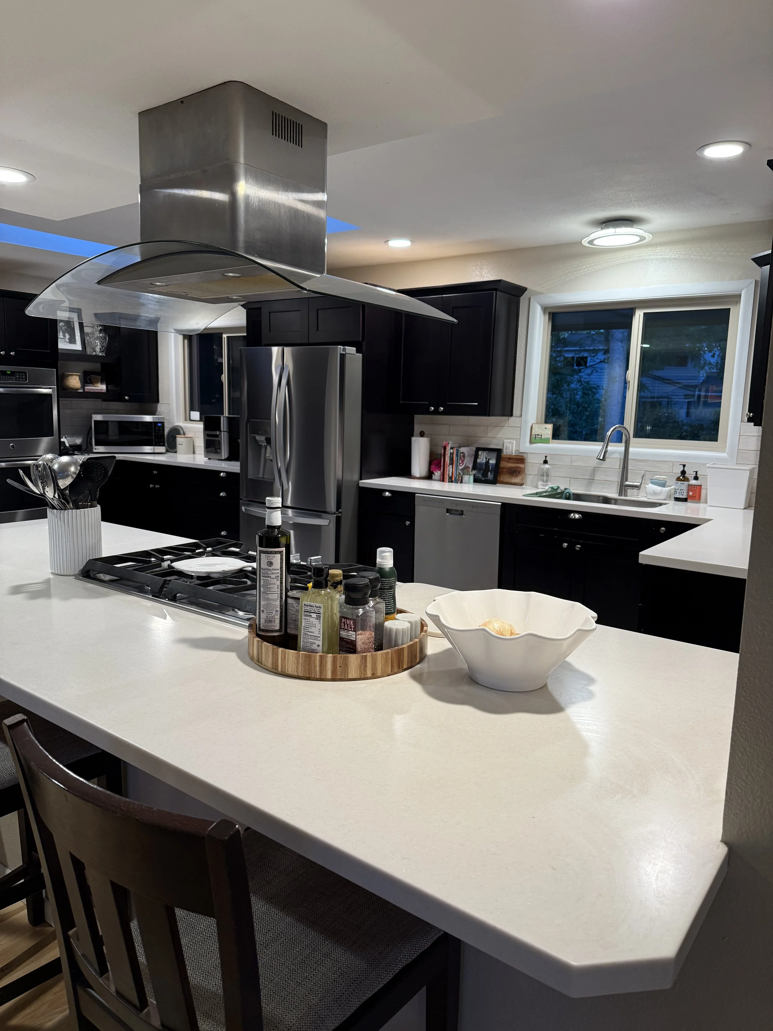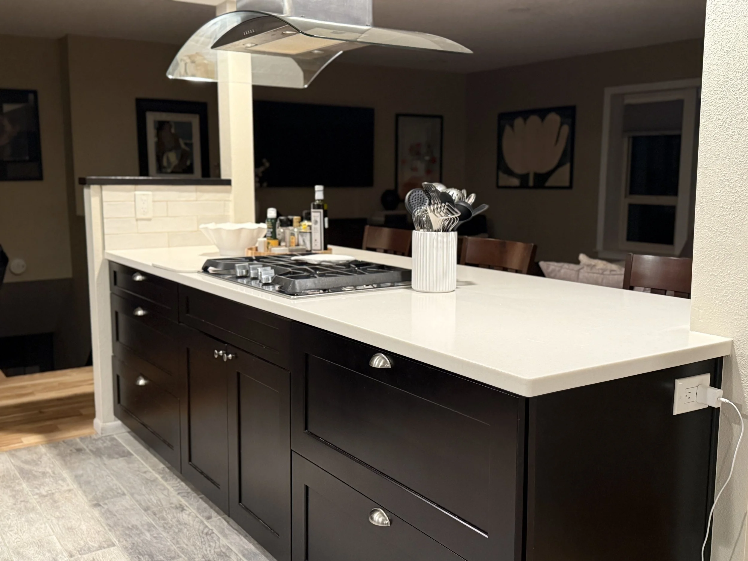 We began by rethinking the layout to improve flow and function. Walls were opened to create connection between the kitchen and main living areas, allowing natural light to flood in. Durable yet elegant materials — including quartz countertops, custom cabinetry, and matte hardware — replaced the dated finishes, giving the room both polish and practicality.